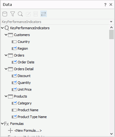 The Data panel is an integrated interface for managing the data resources that you can use in the current report (to display the panel, navigate to Home/View > Data). The panel consists of a toolbar, a dataset drop-down list, and a field panel. This topic introduces the usages of these elements.