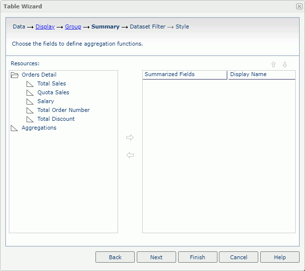to summarize data in the table: in the right box, specify the group to which you want to apply the aggregation, then select an aggregation object in the Resources box and add it to the right box. You can add several aggregations for any group level. You can select