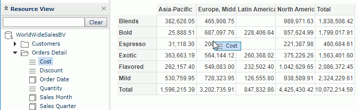 From the Resource View panel, you can drag view elements and dynamic resources into a crosstab to add new column/row headers and aggregations in the crosstab. To do this, first select the crosstab to locate the business view it uses in the Resource View panel, then: