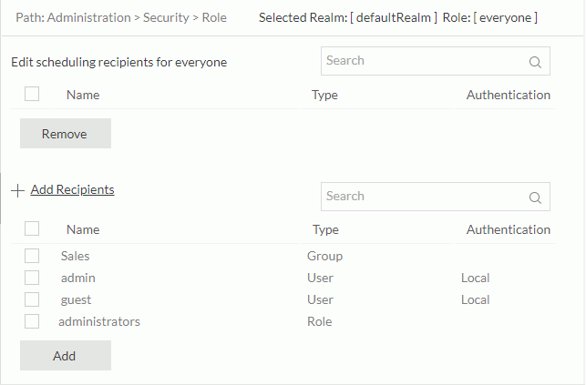 Report Server adopts permission control on the scheduling recipients each user can access. You can customize the scheduling recipients for a role so that when the users holding the role schedule report tasks to publish reports to email, they are able to select the recipients allowed for the role to use the recipients' addresses to send the email.